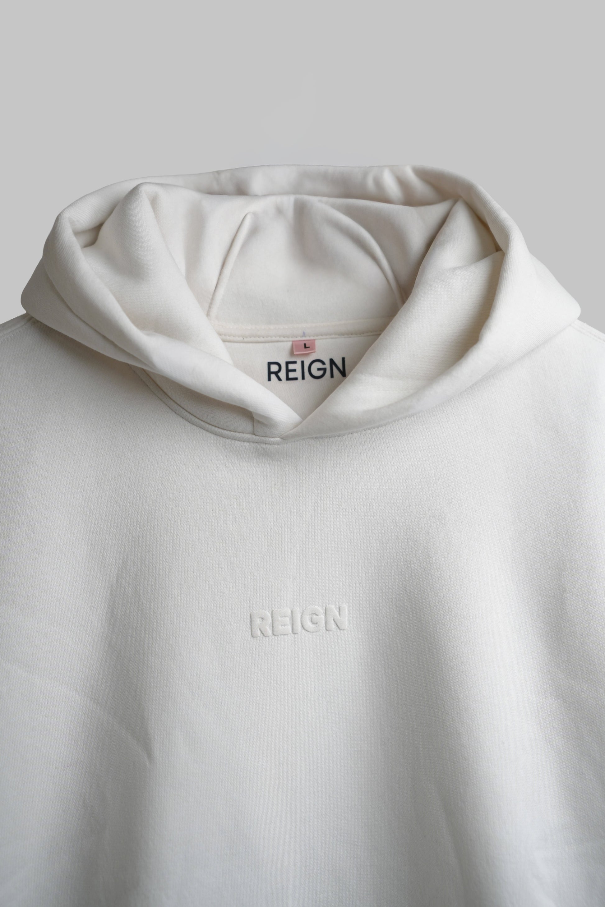 - Front: Minimal REIGN puff print logo in tonal white – understated and powerful.